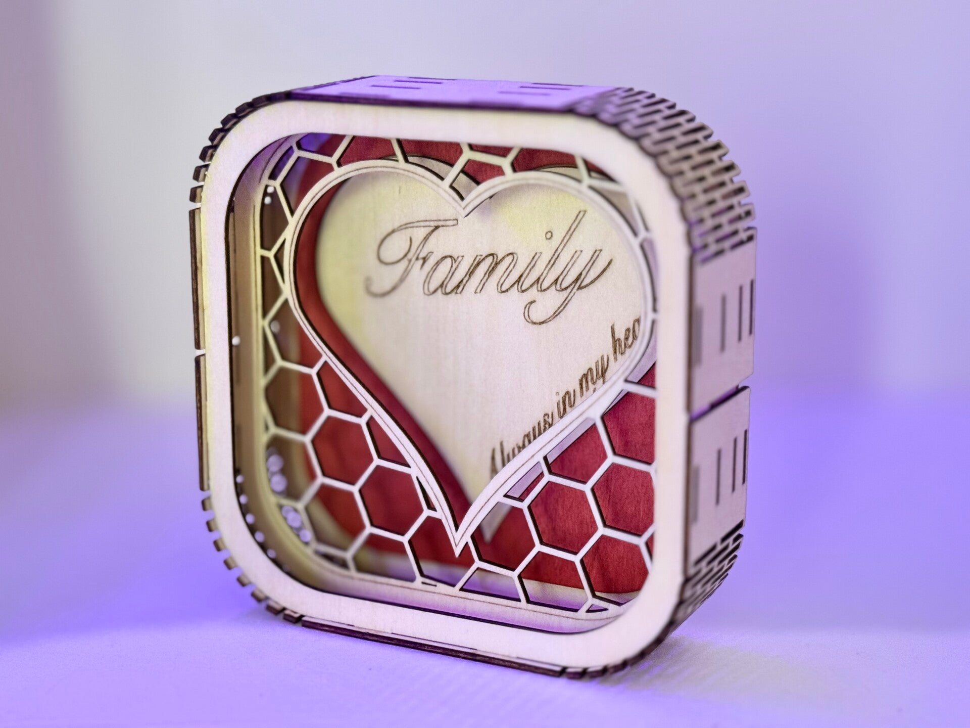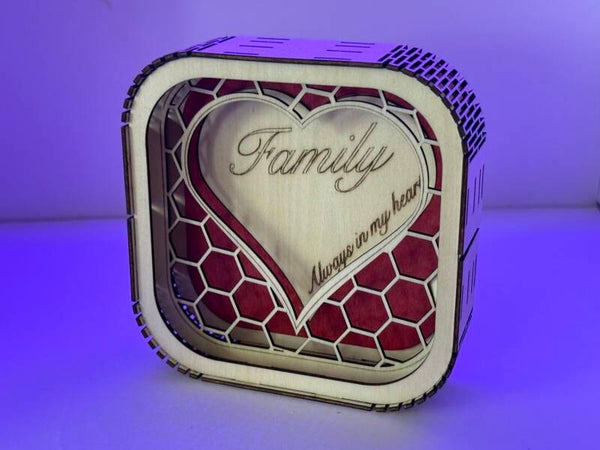 As featured is our reversed heart red wood stain back panel with a engraved plain heart family message. Framed with a honcomb inner heart showing where family lives.