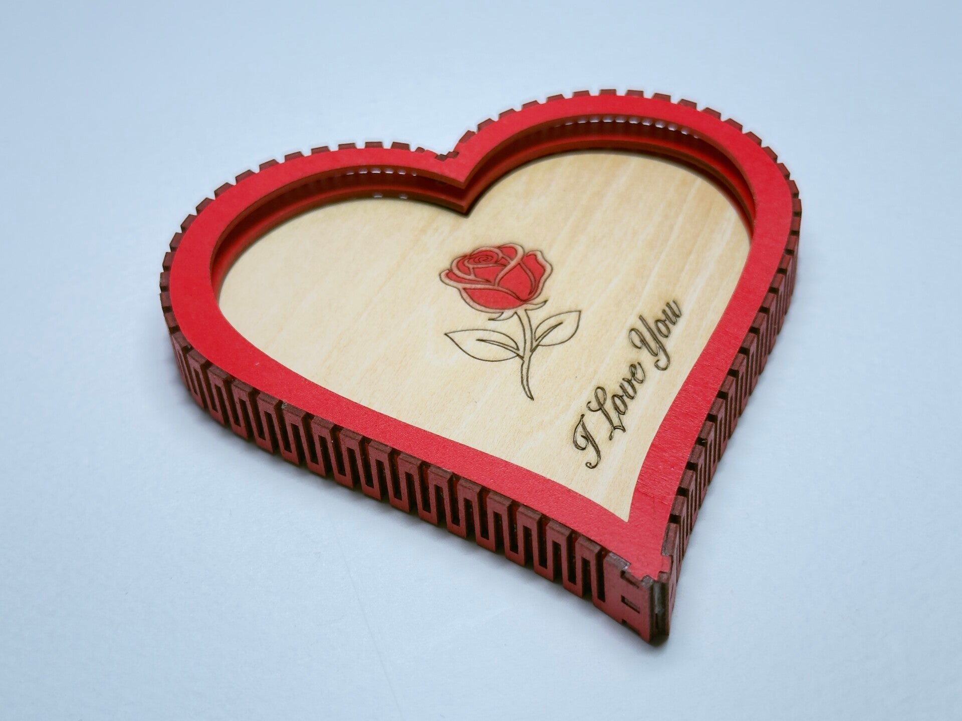 - Beautifully decorated with a warm red outer lattice frame, carefully complemented by a laser-etched red rose featuring the scripted message, “I LOVE YOU.”