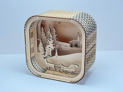 Christmas lodge & sleigh scene display. Laser-cut craft.
